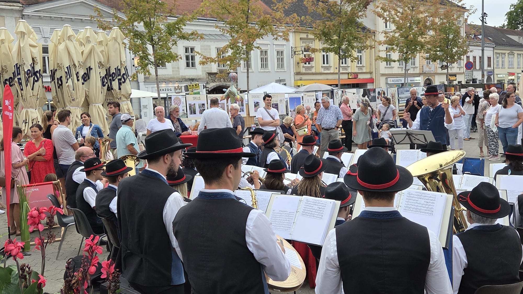 eingeladen. Es handelt sich dabei um eine tolle Open Air-Ausstellung von Kunstwerken, sei es Malerei, Skulptur, Schmuck……Alles war wieder vertreten. Auch die Stadtmusik Korneuburg unter der